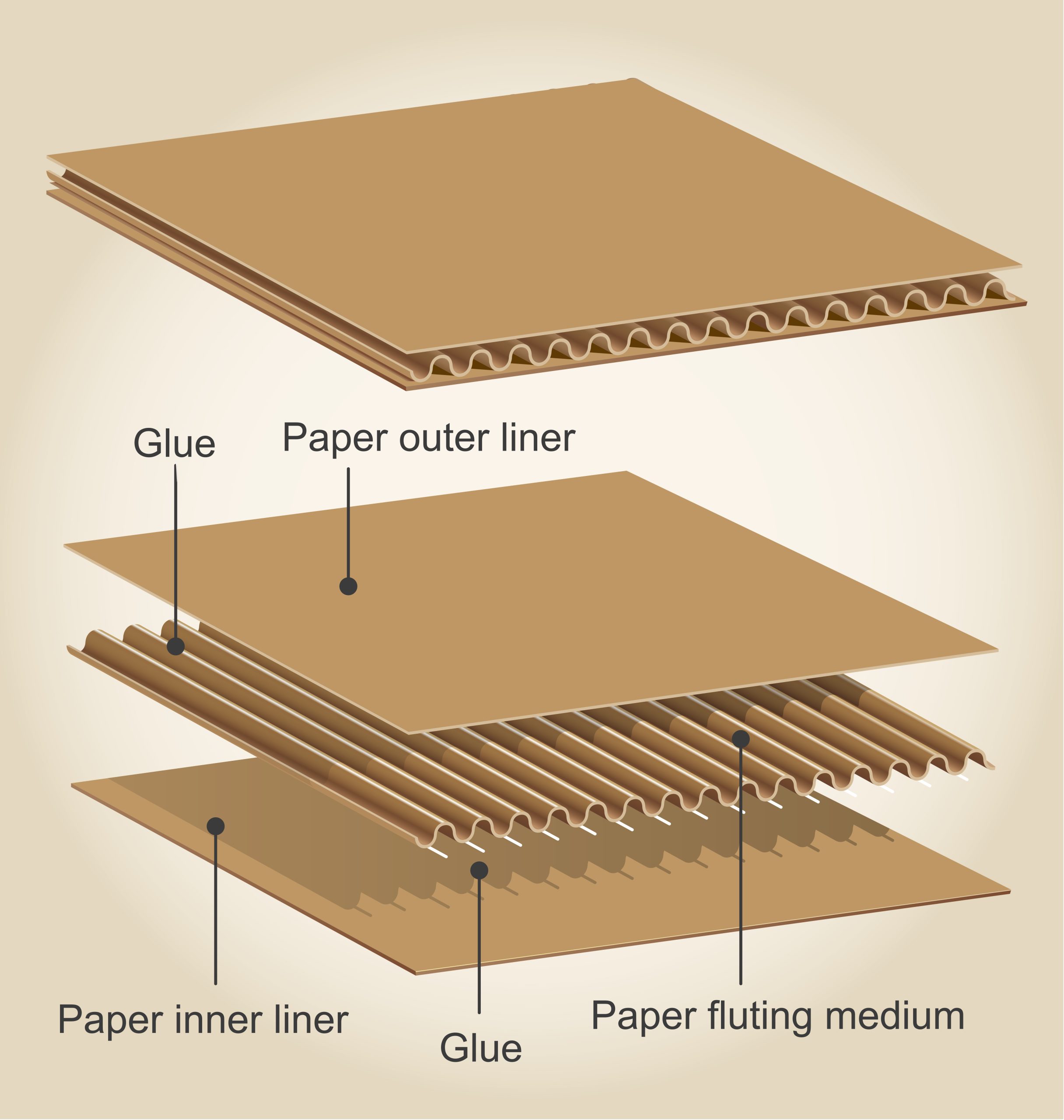 - The medium (consider this as the wavey or corrugated part of the cardboard that is generally seen in the middle between two flat sheets).